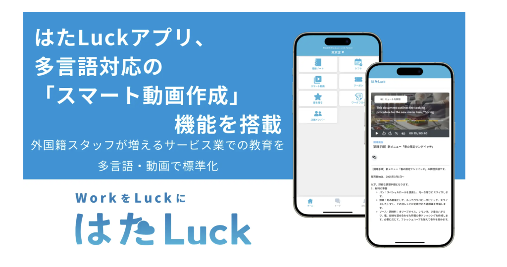 株式会社VideoStep(本社:東京都港区、代表取締役:迎 健太、以下「VideoStep」)と業務提携し、はたLuckアプリで「スマート動画作成」のオプション機能を提供することをお知らせします。これにより外国籍スタッフが増えるサービス業におけるスタッフ教育をの多言語化と動画による標準化を支援していきます。